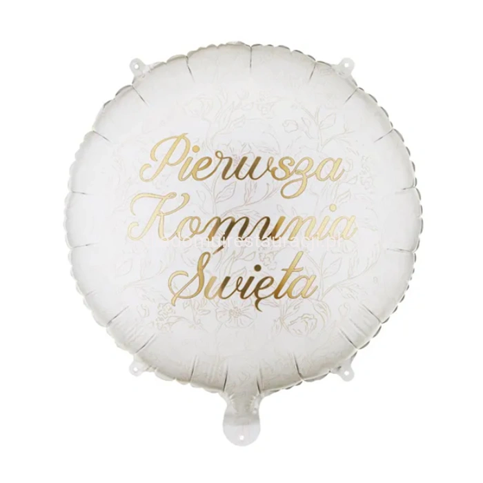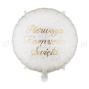 Balon foliowy pastylka ''Pierwsza komunia święta'', w kolorze białym ze złotym napisem i beżowymi kwiatami. Wymiary przed napompowaniem ok. 45 x 45 cm (18 x 18''), wymiary po napompowaniu ok. 35 x 35 cm (14 x 14''). Do napompowania powietrzem i helem. Zestaw zawiera słomkę.