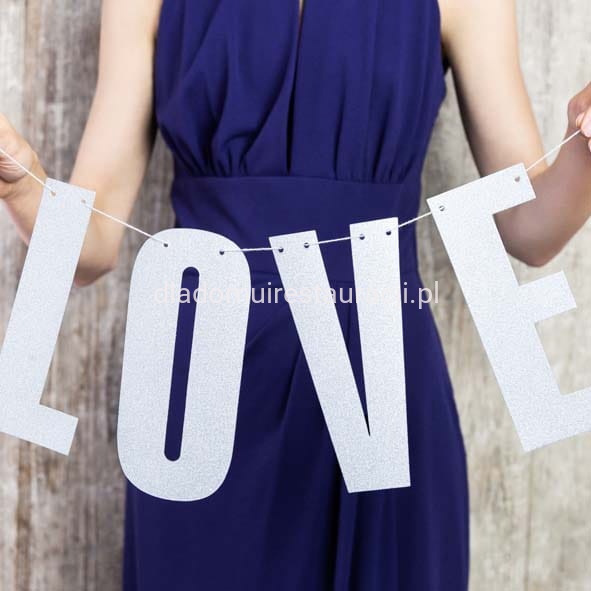 Baner - napis LOVE to uzupełnienie dekoracji weselnej lub walentynkowej. Można powiesić go nad miejscem, w którym siedzą Państwo Młodzi lub przed wejściem do sali weselnej. Mocowanie baneru jest niezwykle proste, ponieważ zestaw zawiera 2m białego sznurka. Czcionka i kolor zostały dobrane tak, aby nawiązywały typowo do charakteru przyjęcia weselnego lub walentynkowego.