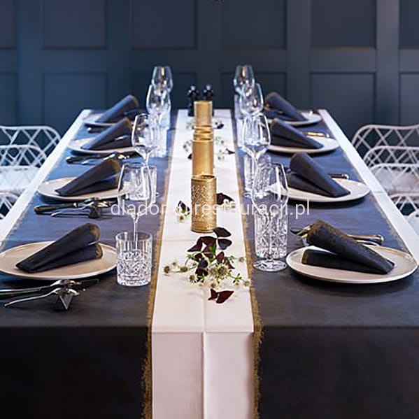 Kompatybilność z pozostałymi elementami kolekcji- Bieżnik Royal najlepiej prezentuje się w połączeniu z serwetkami flizelinowymi lub papierowymi z tej samej kolekcji. Umożliwia spójną aranżację stołu bez konieczności stosowania dodatkowych ozdób.