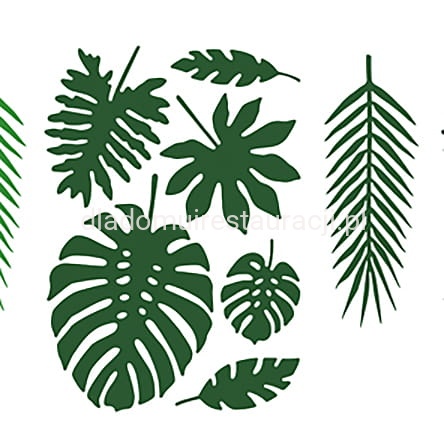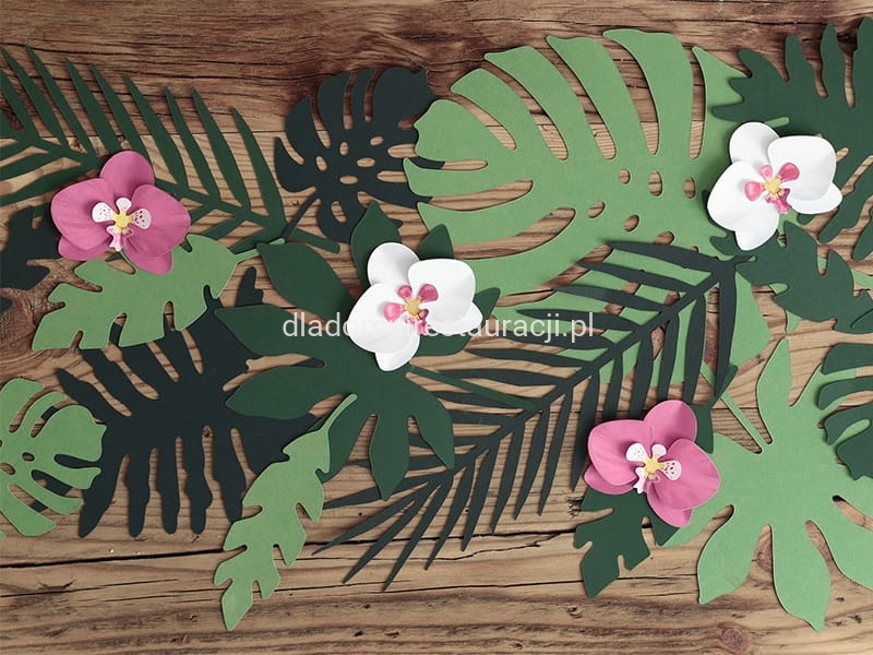 Dekoracje papierowe Aloha wycinane laserowo. Zestaw zawiera siedem różnych kształtów liści tropikalnych w trzech odcieniach zieleni. Pięknie ozdobią stół oraz salę urodzinową w klimacie hawajskim.