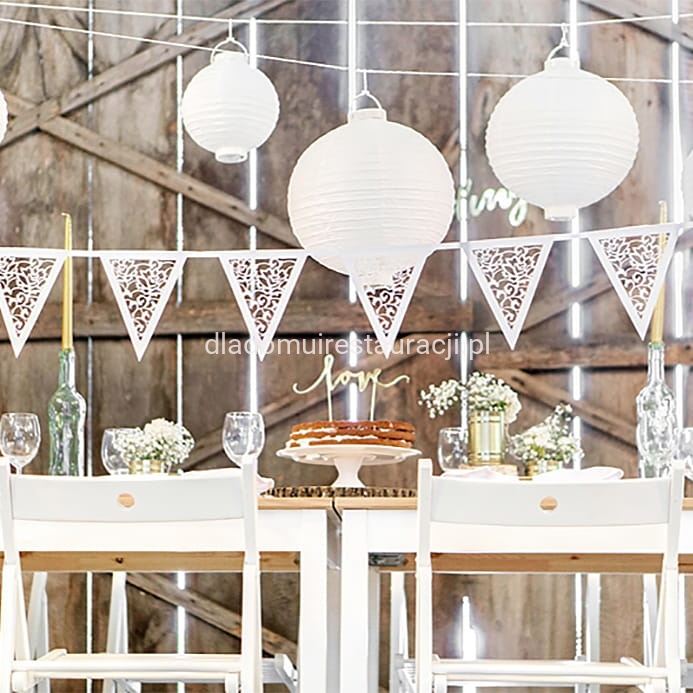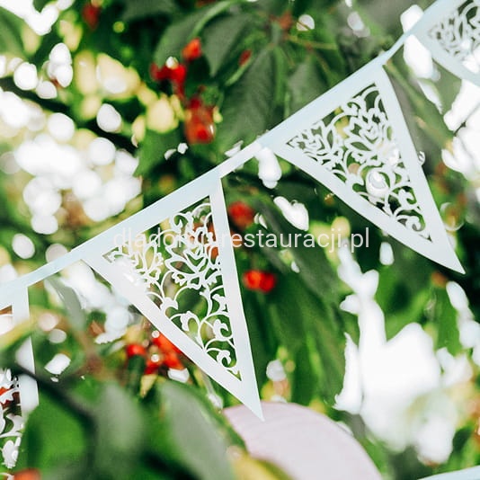Girlanda Ażurowa Flagietki 19,5cm x 300cm to elegancka i efektowna ozdoba, która świetnie sprawdzi się podczas wesel, komunii, chrzcin, jubileuszy oraz imprez plenerowych. Ażurowy wzór dodaje lekkości i subtelności, podkreślając wyjątkowy charakter uroczystości.