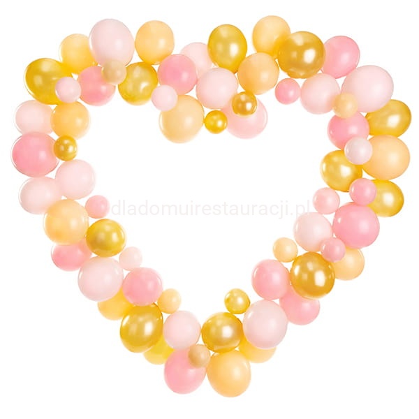Różowa girlanda balonowa ze stelażem Serce, zestaw zawiera 68 balonów lateksowych (17 szt. w kolorze Pastel Pale Pink, 17 szt. w kolorze Pastel Baby Pink, 17 szt. w kolorze Pastel Light Peach, 17 szt. w kolorze Metallic Gold), 16 kartonowych elementów, 20 szt. naklejek dwustronnych, instrukcję. Wymiary po złożeniu ok 166 x 160 cm.