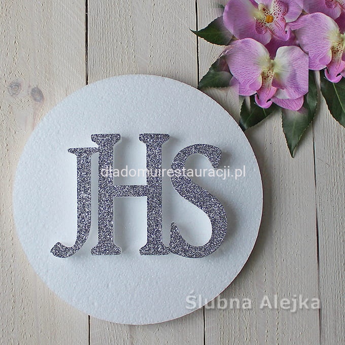 Bardzo estetyczna dekoracja w kształcie hostii na I-szą Komunię Świętą. Napis IHS wykończony srebrnym brokatem. Bardzo lekka i łatwa do powieszenia ozdoba. Wystarczy podwiesić na żyłce lub podpiąć szpileczkami. Będzie wspaniałą dekoracją centralną przyjęcia komunijnego, czy kościoła. Wykonana z dobrego, zbitego styropianu ciętego termicznie. Dzięki temu kulki tworzą gładką powierzchnię i nie sypią się. Wielkość napisu IHS 11 cm.