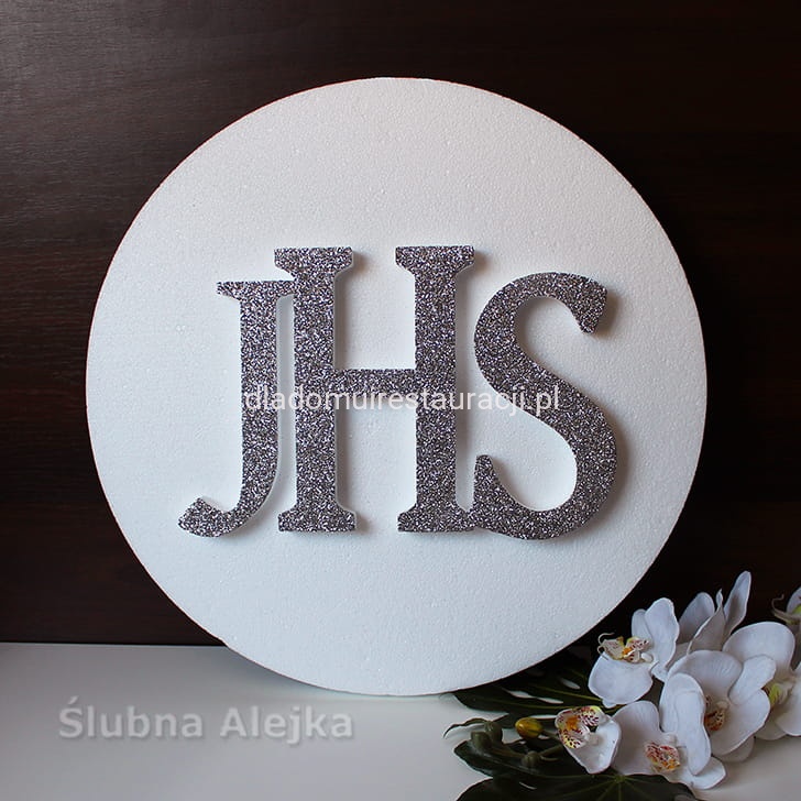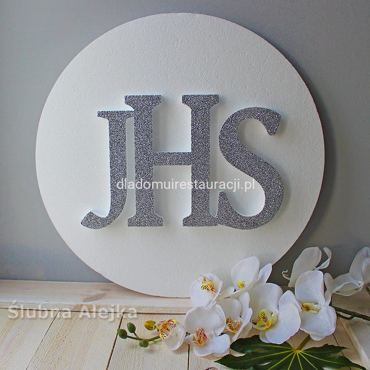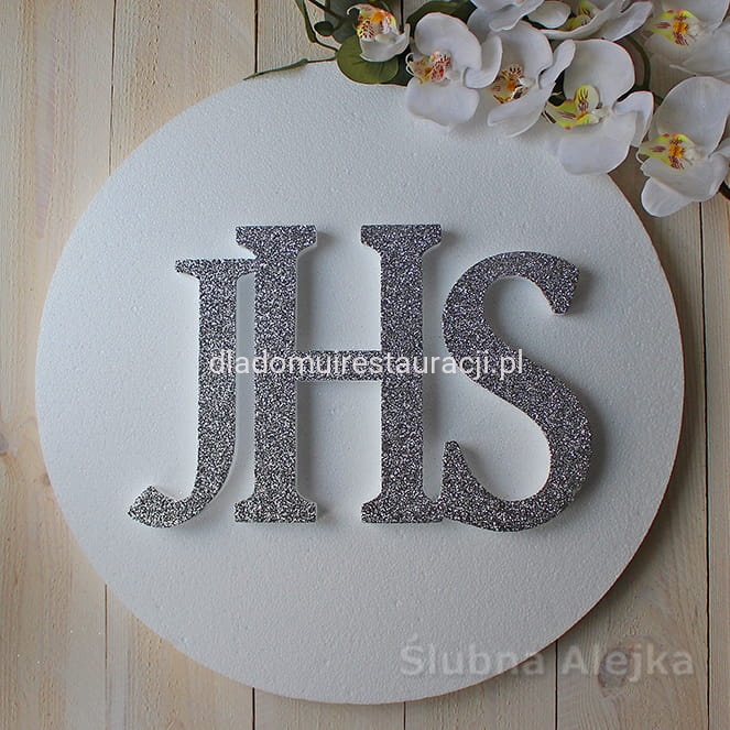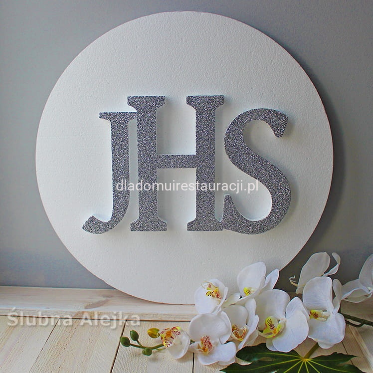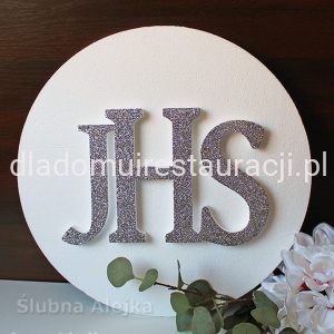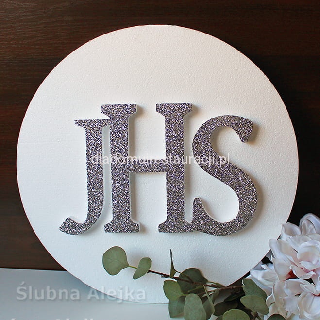 Bardzo estetyczna dekoracja w kształcie dużej hostii na I-szą Komunię Świętą. Napis IHS wykończony srebrnym brokatem. Bardzo lekka i łatwa do powieszenia ozdoba. Wystarczy podwiesić na żyłce lub podpiąć szpileczkami. Będzie wspaniałą dekoracją centralną przyjęcia komunijnego, czy kościoła. Wykonana z dobrego, zbitego styropianu ciętego termicznie. Dzięki temu kulki tworzą gładką powierzchnię i nie sypią się. Wielkość napisu IHS 21 cm.