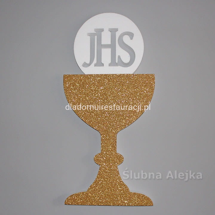 Bardzo estetyczna dekoracja w kształcie kielicha na I-szą Komunię Świętą. Kielich wykończony złotym brokatem. Bardzo lekka i łatwa do powieszenia ozdoba. Wystarczy podwiesić na żyłce lub podpiąć szpileczkami. Będzie wspaniałą ozdobą przyjęcia komunijnego, czy kościoła. Wykonana z dobrego, zbitego styropianu ciętego termicznie. Dzięki temu kulki tworzą gładką powierzchnię i nie sypią się. Wielkość napisu IHS 10 cm.