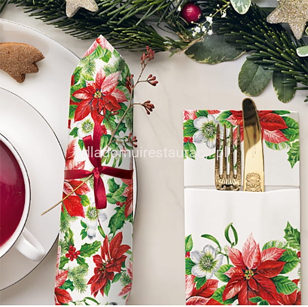 Kieszonki Flizelinowe Glory Poinsettia to funkcjonalny element nakrycia stołu, który pozwala estetycznie zorganizować przestrzeń wokół talerza. Ich zadaniem jest przechowywanie sztućców w higieniczny i elegancki sposób, co wpływa zarówno na komfort gości, jak i wizualny odbiór całej aranżacji.