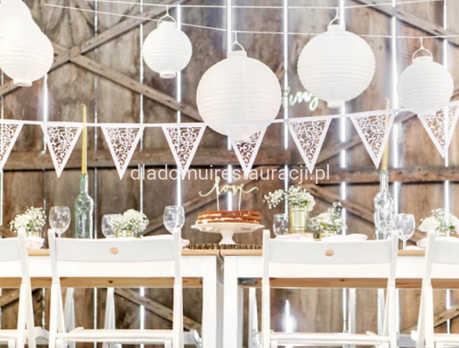 Białe lampiony papierowe świetnie komponują się z punktowym, kolorowym oświetleniem. Dzięki temu można uzyskać wielowymiarową i nastrojową przestrzeń. W połączeniu w większej ilości tworzą imponującą dekorację pod sufitem.