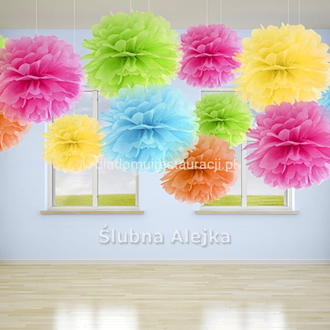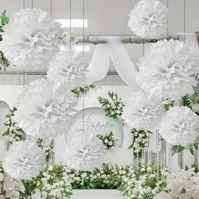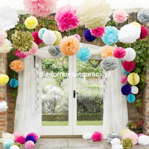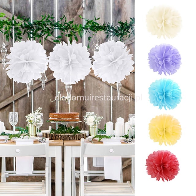 Dostępna paleta barw pozwala dopasować pompony do kolorystyki całej sali lub tematyki przyjęcia. To uniwersalne rozwiązanie, które sprawdzi się zarówno podczas wesela, jak i innych uroczystości.
