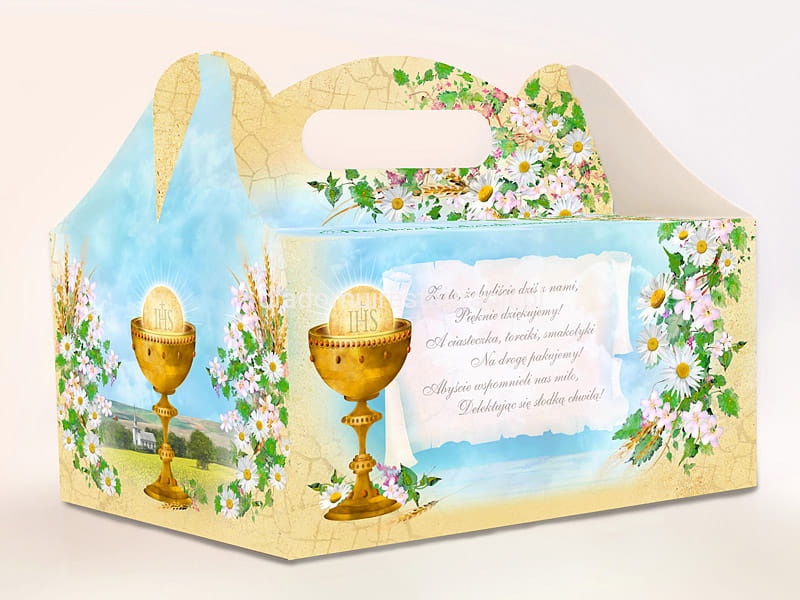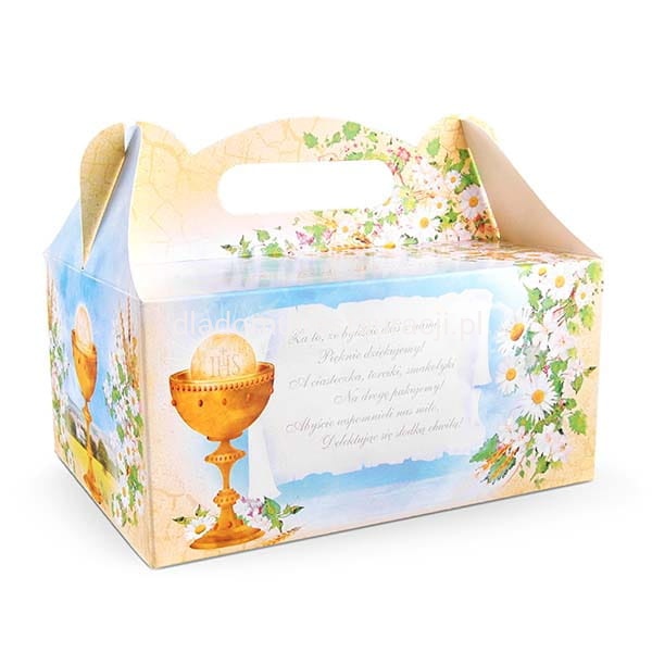 Ozdobne pudełko na ciasto komunijne, z nadrukiem złotego kielicha i kwitnących kwiatków.