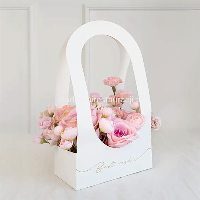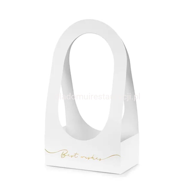 Ozdobne pudełko na kwiaty Flowerbox ze złotym napisem Best Wishes to pudełko z papieru w kolorze białym z perłowym, błyszczącym nadrukiem gałązek z listkami i kwiatkami. Pudełko do samodzielnego złożenia bez użycia kleju. Wygląda bardzo elegancko i jest wygodną formą podania kwiatów.