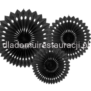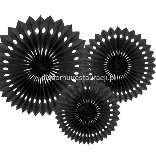 Rozety Dekoracyjne Czarne 3szt. to papierowe, plisowane ozdoby w kształcie koła, które doskonale sprawdzają się jako element aranżacji sali bankietowej, restauracji, kawiarni czy sali weselnej. Występują w różnych rozmiarach i kolorach, dzięki czemu można je łatwo dopasować do charakteru wydarzenia oraz stworzyć oryginalne, przestrzenne kompozycje.