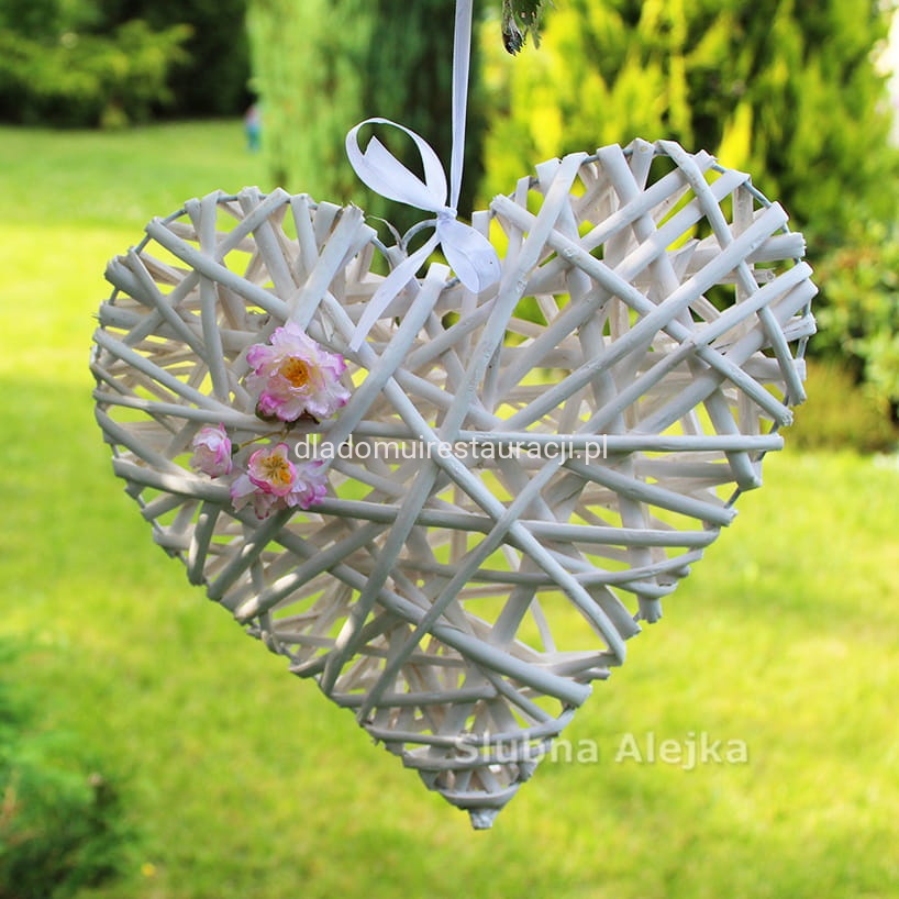 Serce z Wikliny 25x25cm to stylowa i uniwersalna dekoracja, która doskonale sprawdzi się podczas ceremonii ślubnych i weselnych przyjęć. Dzięki dołączonej białej wstążce można je łatwo zawiesić w dowolnym miejscu, tworząc romantyczny klimat.