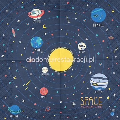Serwetki Kosmos 33x33cm to idealna dekoracja stołu na urodziny i imprezy tematyczne. Motyw planet i gwiazd sprawia, że świetnie wpisują się w aranżacje w kosmicznym klimacie, zachwycając zarówno dzieci, jak i dorosłych.