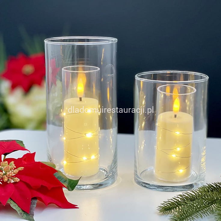 Świeca Ozdobna LED Bezpłomieniowa Girlanda swoim wyglądem niemal identycznie odwzorowuje tradycyjną świecę pieńkową w szkle z dodatkowym sznurem led w środku. Posiada eleganckie wykończenie z tworzywa sztucznego i ciepły biały płomień, dzięki czemu doskonale sprawdza się w eleganckich aranżacjach stołów w restauracjach, hotelach, kawiarniach oraz w domu. Zasilana 2 bateriami AA, zachowuje żywotność nawet do 25 000 godzin, gwarantując długotrwały efekt świetlny bez ryzyka poparzenia czy zabrudzenia woskiem.
