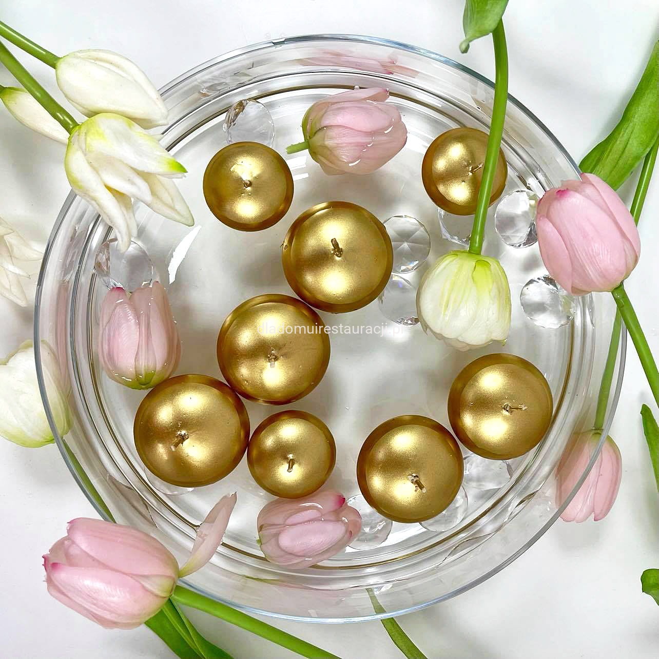 Świece pływające w kształcie dysków pięknie prezentują się w misach, wazonach, szklanych cylindrach lub dekoracyjnych naczyniach wypełnionych wodą. Można je łączyć z płatkami kwiatów, kryształkami dekoracyjnymi lub elementami roślinnymi, tworząc romantyczny i efektowny wystrój.