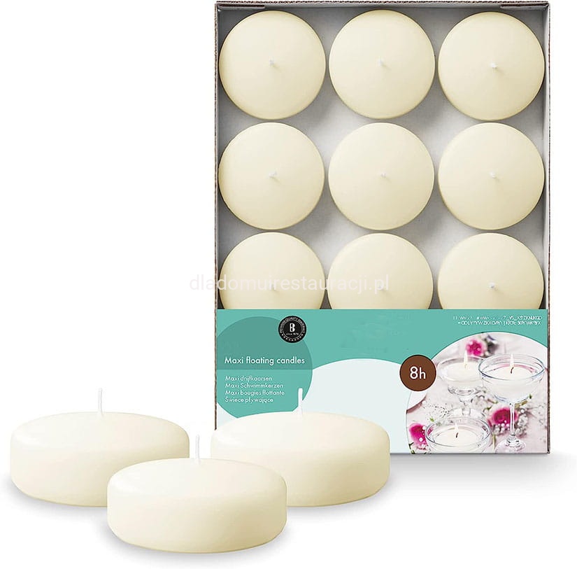 Świeczki pływające dyski XXL – dekoracyjne świece do aranżacji wodnych to płaskie świece w formie dysku, przeznaczone do dekoracji stołów, kompozycji wodnych oraz przestrzeni plenerowych. Dzięki swojej konstrukcji stabilnie unoszą się na wodzie, zachowując estetyczny wygląd przez cały czas palenia. Matowe wykończenie umożliwia łatwe dopasowanie świecy do stylu aranżacji – zarówno w restauracji, hotelu, jak i podczas uroczystości plenerowych.