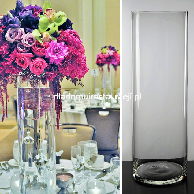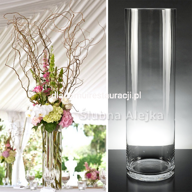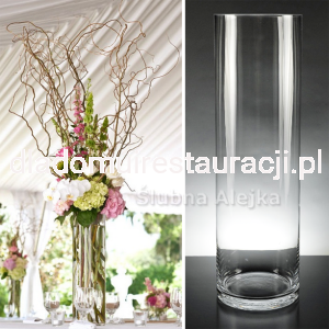 Wazon szklany o cylindrycznym kształcie w wyjątkowym rozmiarze 80 cm wysokości jest przeznaczony do przygotowywania niezwykłych dekoracji weselnych i ślubnych. Wysoki wazon może stanowić centralną dekorację stołu weselnego lub być podstawą ślubnej aranżacji florystycznej stosowanej na podłodze w kościele. Niezwykle grube dno wazonu oraz wytrzymałe, szlifowane szkło sprawiają, że wazon Cylinder jest znakomity do tworzenia wysokich dekoracji na bazie kwiatów ciętych, ale także świetnie się sprawdza w dekoracjach z wykorzystaniem kwiatów i owoców zanurzonych w wodzie. Wazon ma prosty, elegancki kształt, który pasuje zarówno do tradycyjnych jak i do nowoczesnych dekoracji sal weselnych.