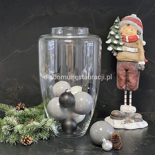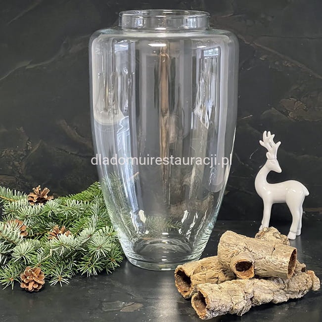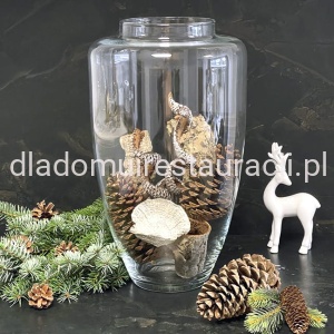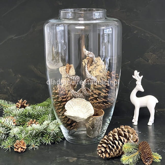 Aranżacje sezonowe i eventowe: Dzięki dużej średnicy otworu i wysokości, wazon można wypełnić ozdobami tematycznymi – szyszkami, bombkami, gałązkami świerkowymi, liśćmi czy lampkami LED. Jest często wykorzystywany podczas świąt, wesel i eventów biznesowych.