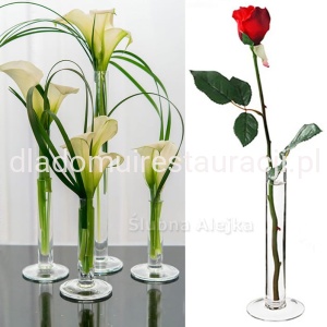 Wazonik szklany Tubka na jeden kwiat jest ozdobą przystosowaną do wyeksponowania jednego ciętego kwiatu. Jego zaletą jest minimalistyczna forma, a smukły kształt wąskiej tubki pozwala podkreślić piękno pojedynczych kwiatów, takich jak róża, gerber, tulipan czy kalia. Wazon można stosować w dekoracji weselnej jako pojedynczą ozdobę na stół lub jako element większej aranżacji złożonej z kilku takich wazonów ułożonych jeden za drugim. Szeroka, okrągła podstawa sprawia, że wazon jest stabilny mimo niewielkiej średnicy. Na dno wazonu można wsypać ozdobne kryształki bądź żwirek, które dodadzą uroku kompozycji.