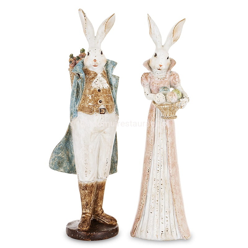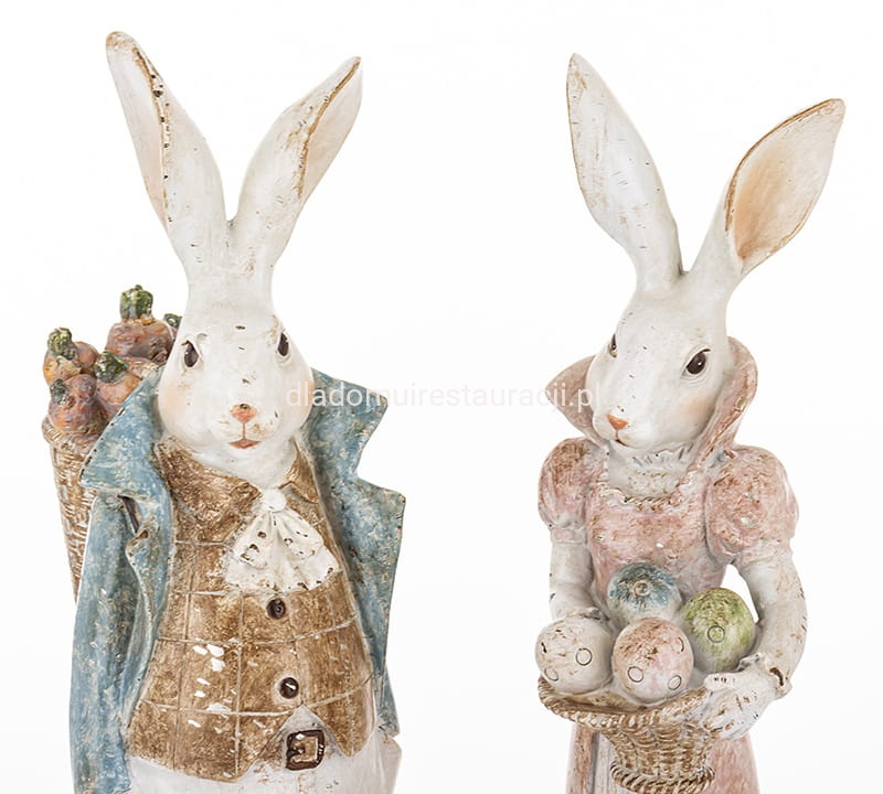 Para zajączków wielkanocnych wykonana z wysokiej jakości tworzywa sztucznego. Ubrani w dystyngowane stroje. Ona i on. Symbolizują nowe życie - odradzającą się ziemię i nadchodzącą wiosnę. Jest również symbolem płodności. Zwyczaj przynoszenia prezentów przez wielkanocnego zajączka przywędrował do nas z Niemiec. Niech więc ozdobi piękne, wielkanocne stoły. Wprowadzi radość i nadzieję na ciepłe wiosenne dni. Będzie również miłym, świątecznym podarunkiem.
